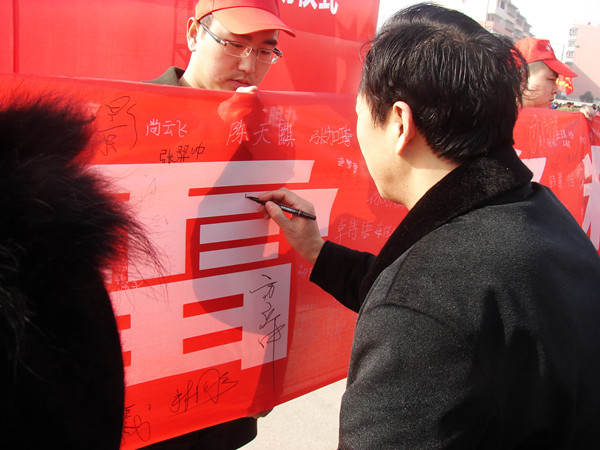 3月4日上午,襄州法院法官志愿者在旭园广场举行的“传承雷锋精神,深化志愿者服务活动”启动仪式上签名。近年来,为传承雷锋精神,襄州法院多次组织法官志愿者走上街头,开展以学雷锋为主题的送法进社区活动,义务为辖区群众提供法律咨询等服务,受到辖区群众一致好评。